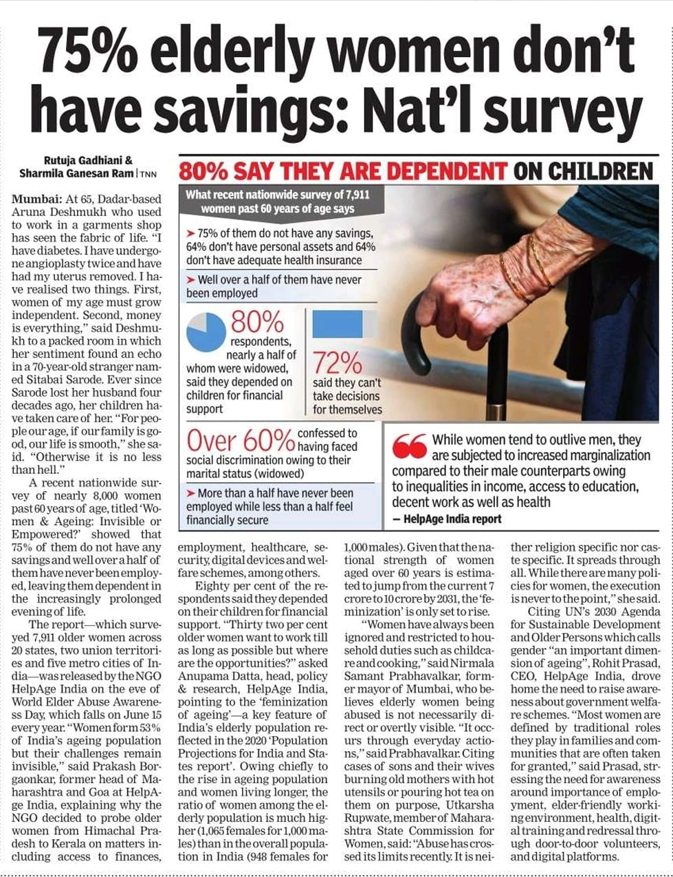 A recent nationwide survey of nearly 8,000 women past 60 years of age, titled ‘Women & Ageing: Invisible or Empowered?’ showed that 75% of them do not have any savings and well over a half of them have never been employed, leaving them dependent in the increasingly prolonged evening of life.